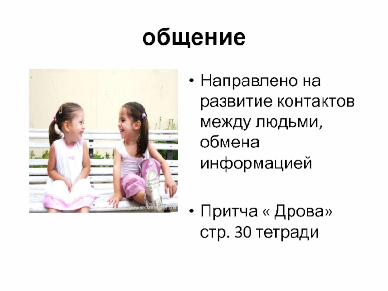 общениеНаправлено на развитие контактов между людьми, обмена информациейПритча « Дрова» стр. 30 тетради