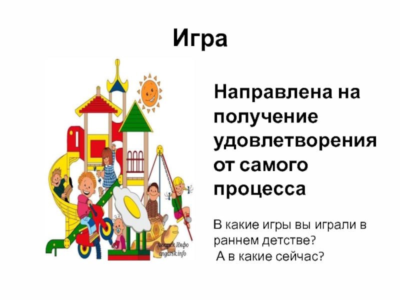 ИграНаправлена на получение удовлетворения от самого процессаВ какие игры вы играли в раннем детстве? А в какие