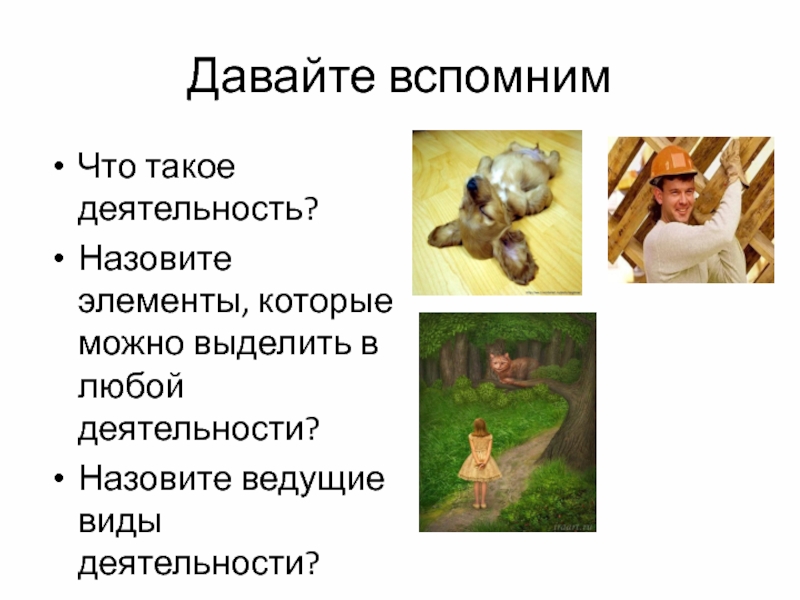 Давайте вспомнимЧто такое деятельность?Назовите элементы, которые можно выделить в любой деятельности?Назовите ведущие виды деятельности?