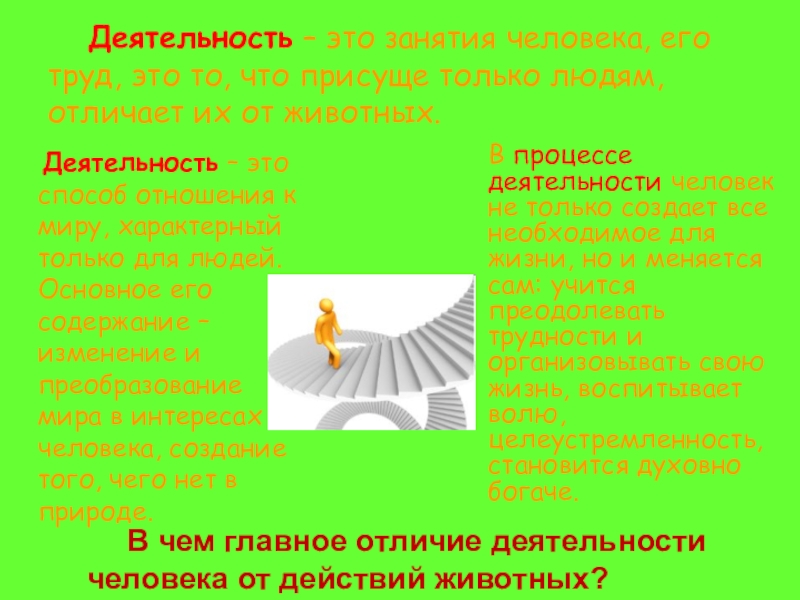 В процессе деятельности человек не только создает все необходимое для жизни, но и меняется сам: учится преодолевать трудности и организовывать свою жизнь, воспитывает волю, целеустремленность, становится духовно богаче.