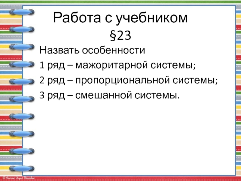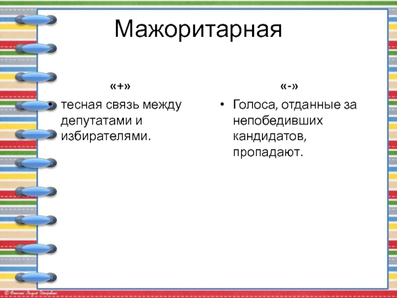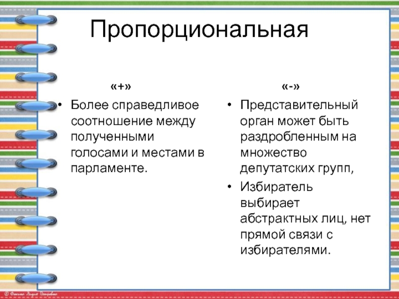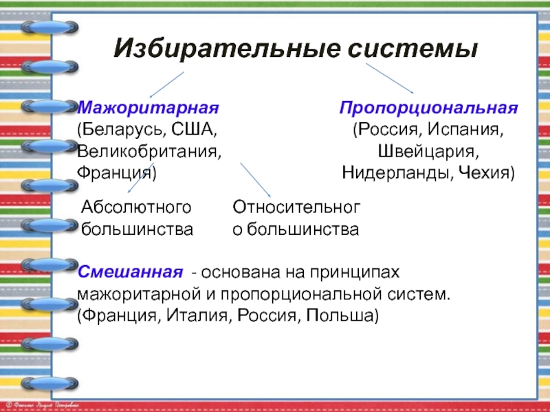 Смешанная - основана на принципах мажоритарной и пропорциональной систем. (Франция, Италия, Россия, Польша)
