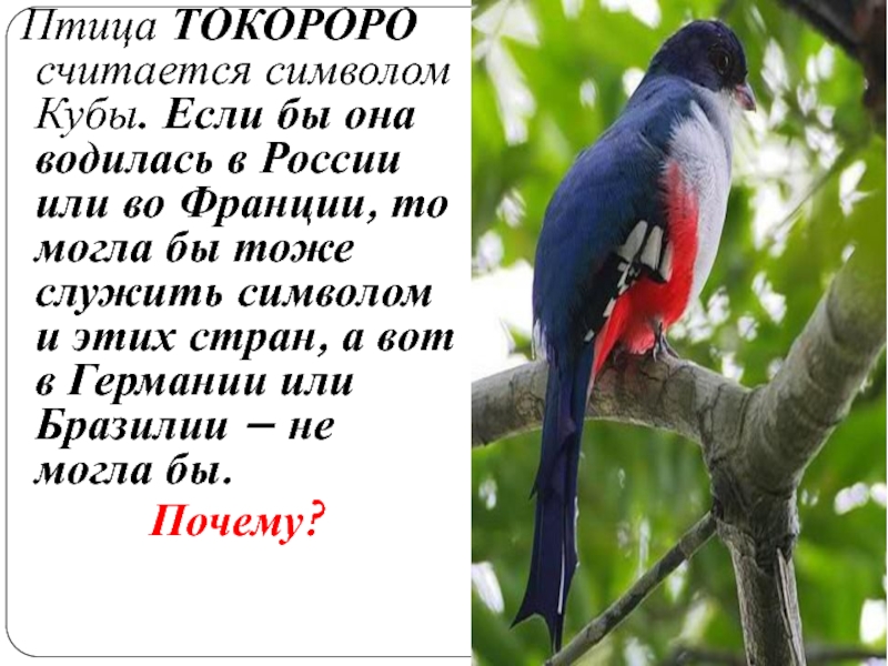 Слайд 8 Птица ТОКОРОРО считается символом Кубы. Если бы она водилась в