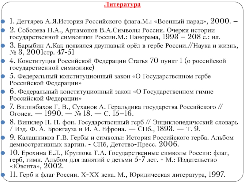 Литература1. Дегтярев А.Я.История Российского флага.М.: «Военный парад», 2000. – 2. Соболева Н.А., Артамонов В.А.Символы России. Очерки истории
