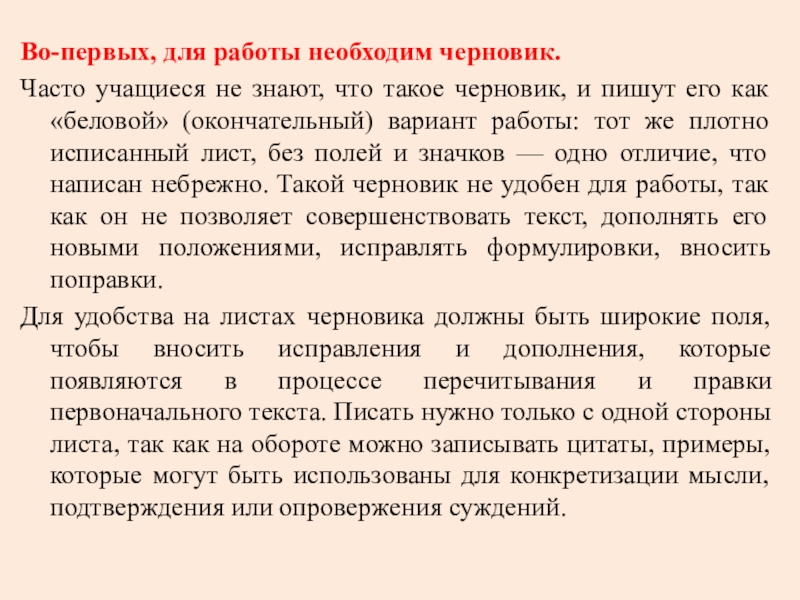 черновик, и пишут его как «беловой» (окончательный) вариант работы: тот же плотно исписанный лист, без полей и значков — одно отличие, что написан небрежно. Такой черновик не удобен для работы, так как он не позволяет совершенствовать текст, дополнять его новыми положениями, исправлять формулировки, вносить поправки.