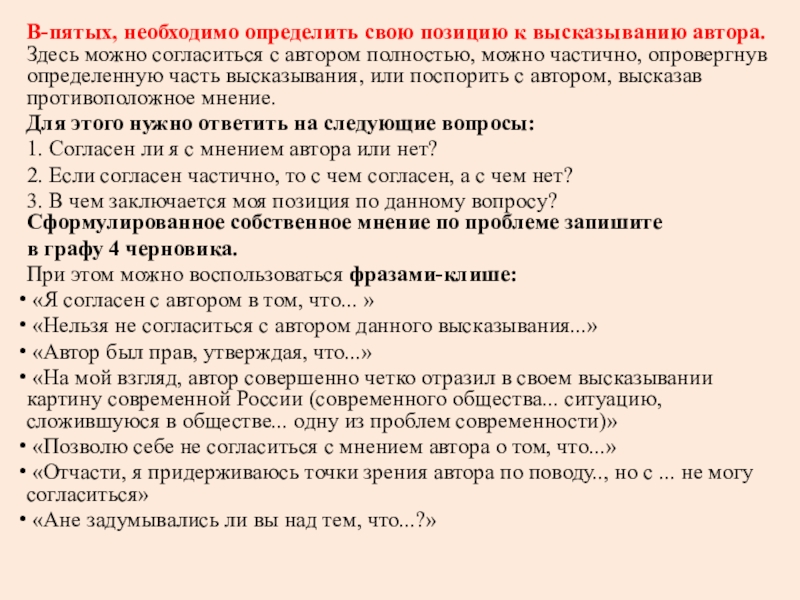 четкая определенность позиции учащегося, его отношения к проблеме, к мнению автора высказывания;