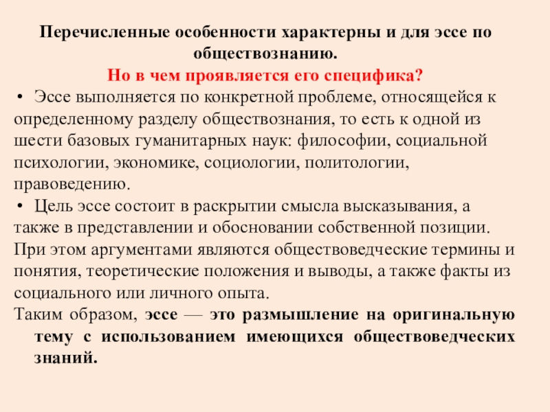 Таким образом, эссе — это размышление на оригинальную тему с использованием имеющихся обществоведческих знаний.