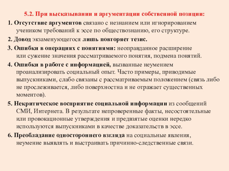 5. Некритическое восприятие социальной информации из сообщений СМИ, Интернета. В результате непроверенные факты, несостоятельные или провокационные утверждения и предвзятые оценки нередко используются выпускниками в качестве доказательств в эссе.