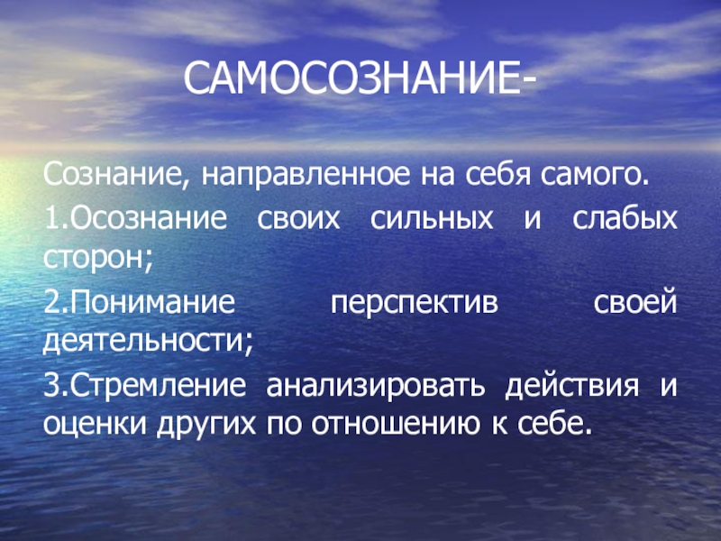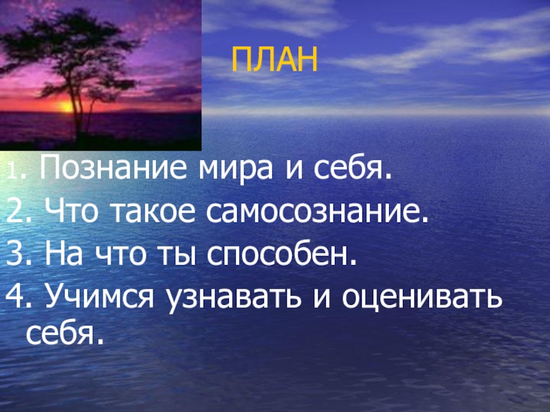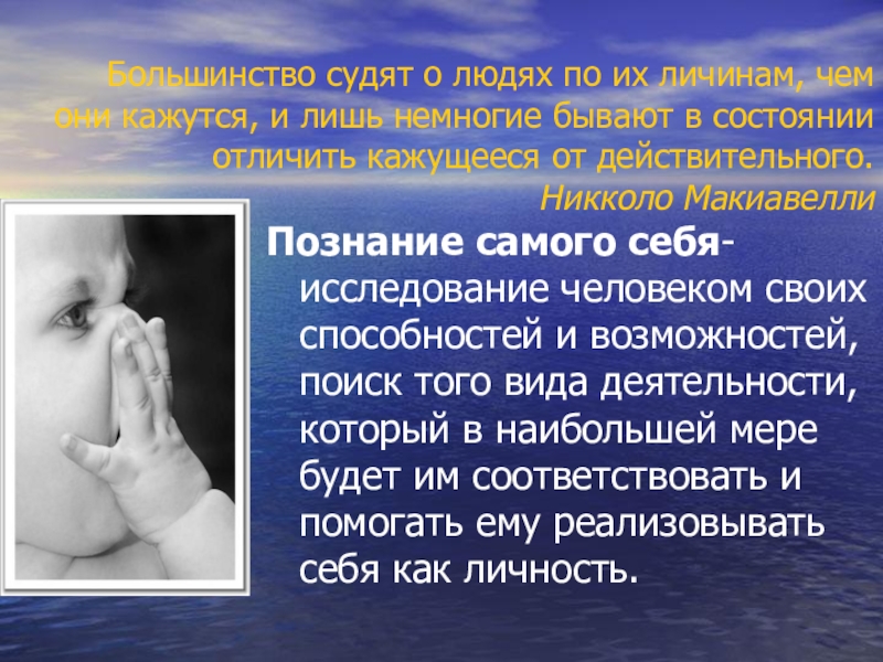 Познание самого себя-исследование человеком своих способностей и возможностей, поиск того вида деятельности, который в наибольшей мере будет им соответствовать и помогать ему реализовывать себя как личность.