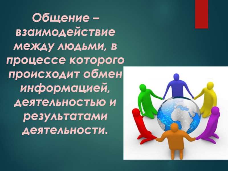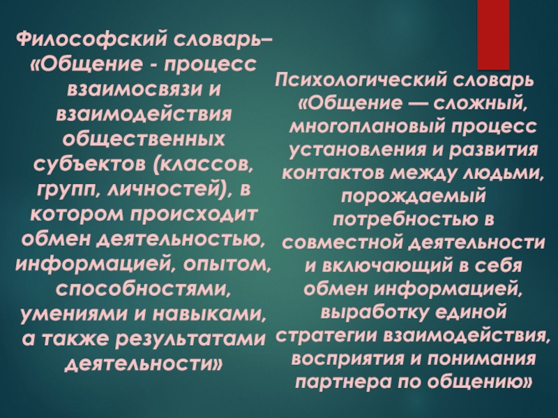 «Общение — сложный, многоплановый процесс установления и развития контактов между людьми, порождаемый потребностью в совместной деятельности и включающий в себя обмен информацией, выработку единой стратегии взаимодействия, восприятия и понимания партнера по общению»