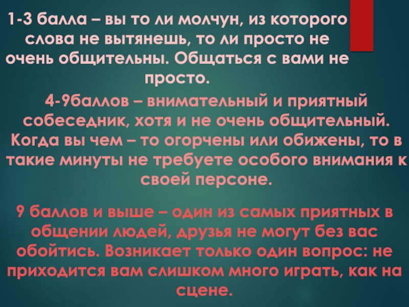 4-9баллов – внимательный и приятный собеседник, хотя и не очень общительный. Когда вы чем – то огорчены или обижены, то в такие минуты не требуете особого внимания к своей персоне.