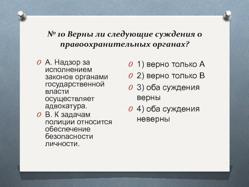 Слайд 23№ 10 Верны ли следующие суждения о правоохранительных органах?