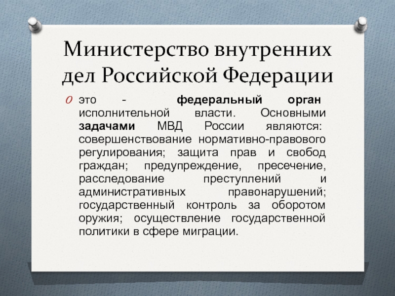 Основными задачами МВД России являются: совершенствование нормативно-правового регулирования; защита прав и свобод граждан; предупреждение, пресечение, расследование преступлений и административных правонарушений; государственный контроль за оборотом оружия; осуществление государственной политики в сфере миграции.