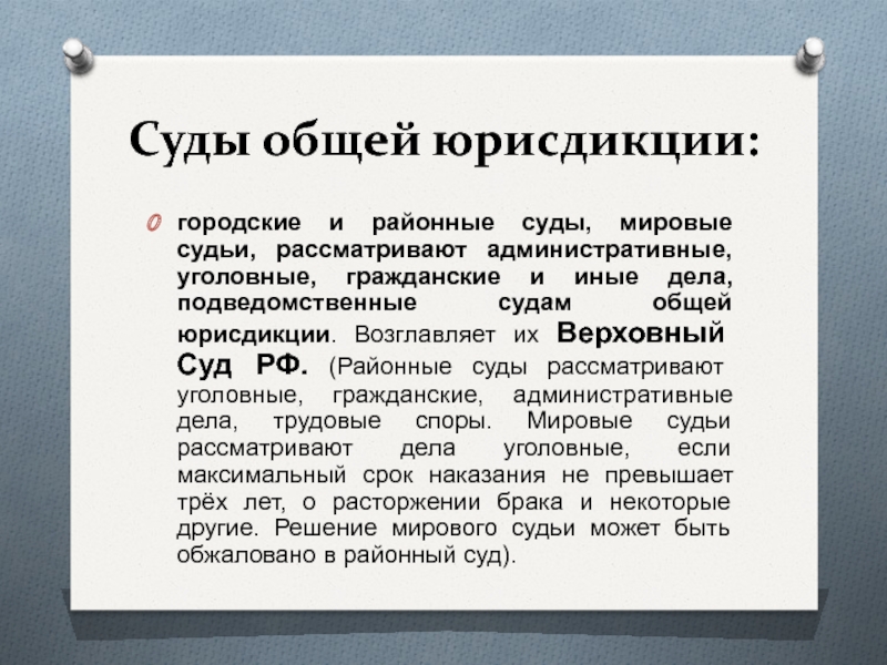 уголовные, гражданские и иные дела, подведомственные судам общей юрисдикции. Возглавляет их Верховный Суд РФ. (Районные суды рассматривают уголовные, гражданские, административные дела, трудовые споры. Мировые судьи рассматривают дела уголовные, если максимальный срок наказания не превышает трёх лет, о расторжении брака и некоторые другие. Решение мирового судьи может быть обжаловано в районный суд).