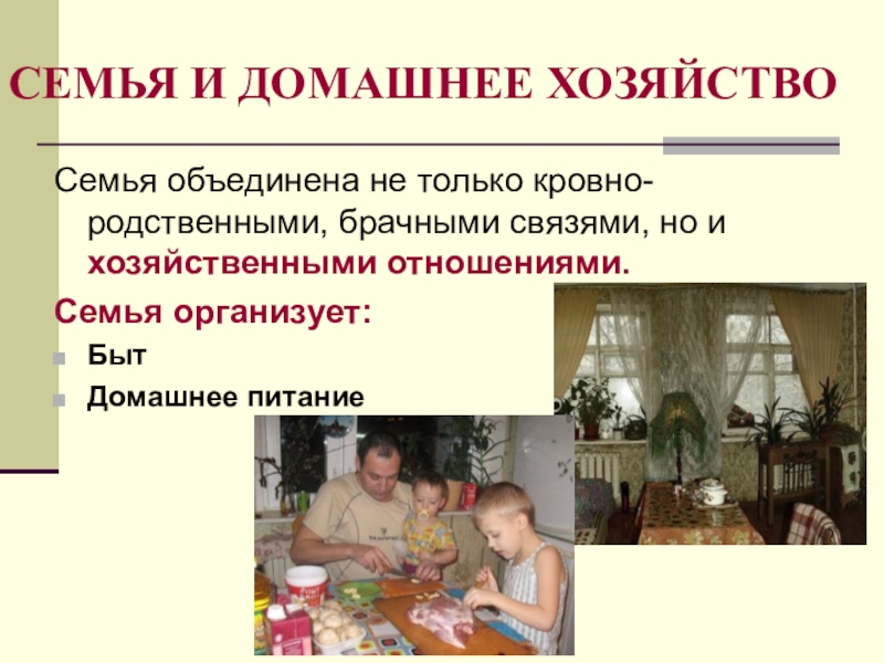 СЕМЬЯ И ДОМАШНЕЕ ХОЗЯЙСТВОСемья объединена не только кровно-родственными, брачными связями, но и хозяйственными отношениями.Семья организует:БытДомашнее питание