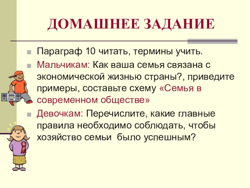 ДОМАШНЕЕ ЗАДАНИЕПараграф 10 читать, термины учить.Мальчикам: Как ваша семья связана с экономической жизнью страны?, приведите примеры, составьте