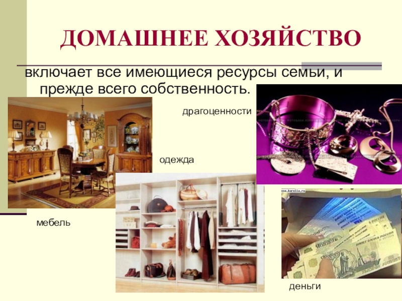 ДОМАШНЕЕ ХОЗЯЙСТВОвключает все имеющиеся ресурсы семьи, и прежде всего собственность.мебельодеждадрагоценностиденьги