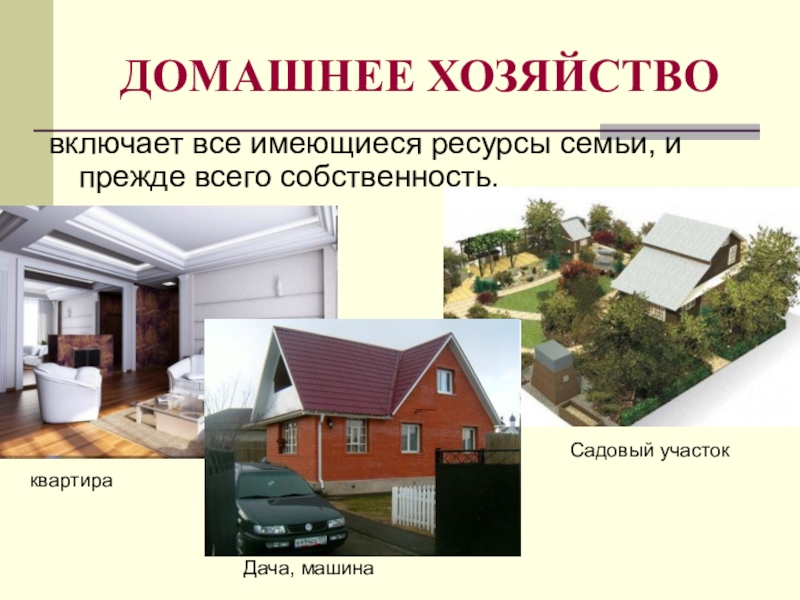 ДОМАШНЕЕ ХОЗЯЙСТВОвключает все имеющиеся ресурсы семьи, и прежде всего собственность.квартираДача, машинаСадовый участок