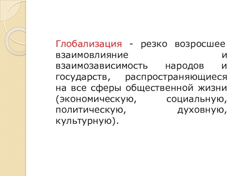 Слайд 3Глобализация - резко возросшее взаимовлияние и взаимозависимость народов и государств, распространяющиеся