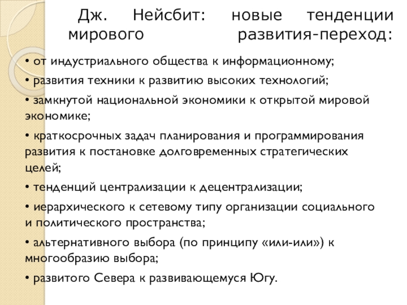 Дж. Нейсбит: новые тенденции мирового развития-переход: • от индустриального общества к информационному;• развития техники к развитию высоких технологий;• замкнутой национальной экономики к открытой мировой экономике;• краткосрочных задач планирования и программирования развития к постановке долговременных стратегических целей;•