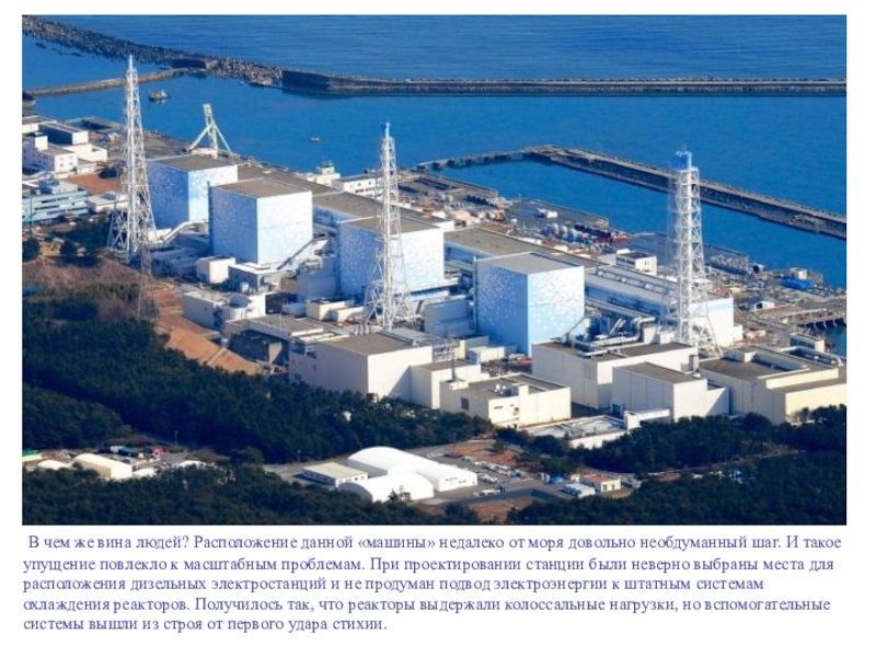 В чем же вина людей? Расположение данной «машины» недалеко от моря довольно необдуманный шаг. И такое упущение повлекло к масштабным проблемам. При проектировании станции были неверно выбраны места для расположения дизельных электростанций и не продуман подвод электроэнергии к штатным системам охлаждения реакторов. Получилось так, что реакторы выдержали колоссальные нагрузки, но вспомогательные системы вышли из строя от первого удара стихии.