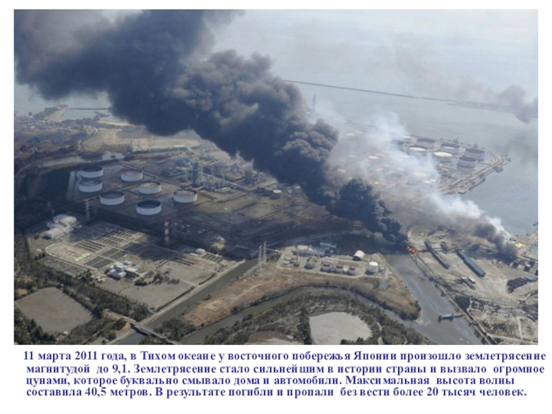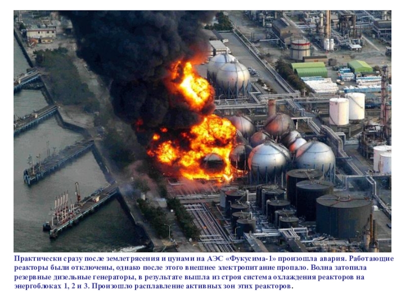 Практически сразу после землетрясения и цунами на АЭС «Фукусима-1» произошла авария. Работающие реакторы были отключены, однако после этого внешнее электропитание пропало. Волна затопила резервные дизельные генераторы, в результате вышла из строя система охлаждения реакторов на энергоблоках 1, 2 и 3. Произошло расплавление активных зон этих реакторов.