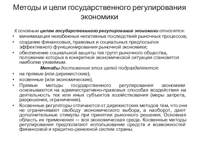 Методы и цели государственного регулирования экономики К основным целям государственного регулирования экономики относятся:минимизация неизбежных негативных последствий рыночных процессов;создание финансовых,