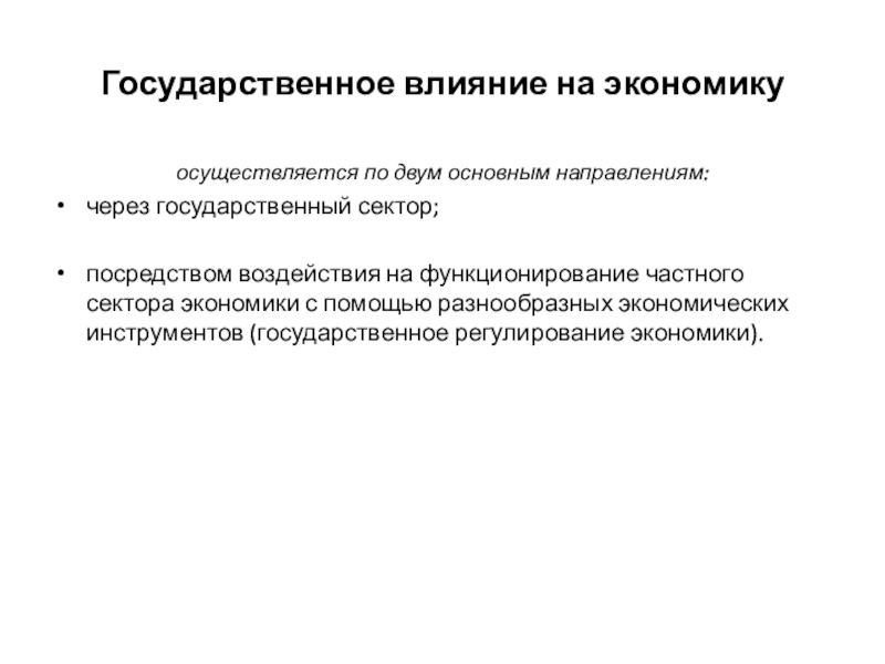 Государственное влияние на экономикуосуществляется по двум основным направлениям:через государственный сектор;посредством воздействия на функционирование частного сектора экономики с