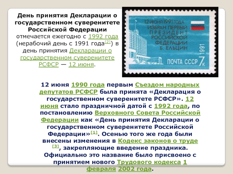 12 июня 1990 года первым Съездом народных депутатов РСФСР была принята «Декларация о государственном суверенитете РСФСР». 12 июня стало праздничной датой с 1992 года, по постановлению Верховного Совета Российской Федерации как «День принятия Декларации о государственном суверенитете Российской Федерации»[1]. Осенью того же года были внесены изменения в Кодекс законов о труде[3], закрепляющие введение праздника. Официально это название было присвоено с принятием нового Трудового кодекса 1 февраля 2002 года.