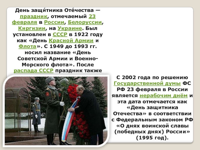 С 2002 года по решению Государственной думы ФС РФ 23 февраля в России является нерабочим днём и эта дата отмечается как «День защитника Отечества» в соответствии с Федеральным законом РФ «О днях воинской славы (победных днях) России» (1995 год).