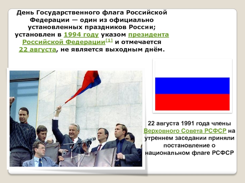 22 августа 1991 года члены Верховного Совета РСФСР на утреннем заседании приняли постановление о национальном флаге РСФСР