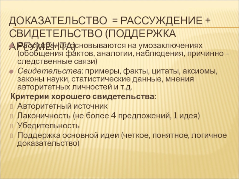 ДОКАЗАТЕЛЬСТВО = Рассуждение + Свидетельство (поддержка аргумента)
