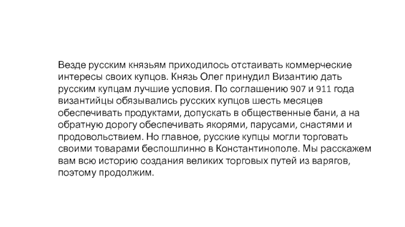 принудил Византию дать русским купцам лучшие условия. По соглашению 907 и 911 года византийцы обязывались русских купцов шесть месяцев обеспечивать продуктами, допускать в общественные бани, а на обратную дорогу обеспечивать якорями, парусами, снастями и продовольствием. Но главное, русские купцы могли торговать своими товарами беспошлинно в Константинополе. Мы расскажем вам всю историю создания великих торговых путей из варягов, поэтому продолжим.