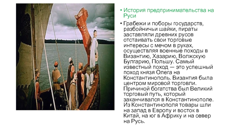 древних русов отстаивать свои торговые интересы с мечом в руках, осуществляя военные походы в Византию, Хазарию, Волжскую Булгарию, Польшу. Самый известный поход — это успешный поход князя Олега на Константинополь. Византия была центром мировой торговли. Причиной богатства был Великий торговый путь, который заканчивался в Константинополе. Из Константинополя товары шли на запад в Европу и восток в Китай, на юг в Африку и на север на Русь.