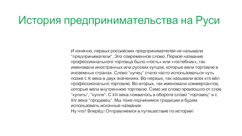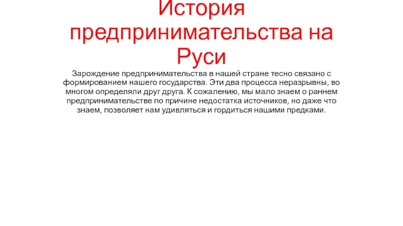 формированием нашего государства. Эти два процесса неразрывны, во многом определяли друг друга. К сожалению, мы мало знаем о раннем предпринимательстве по причине недостатка источников, но даже что знаем, позволяет нам удивляться и гордиться нашими предками.