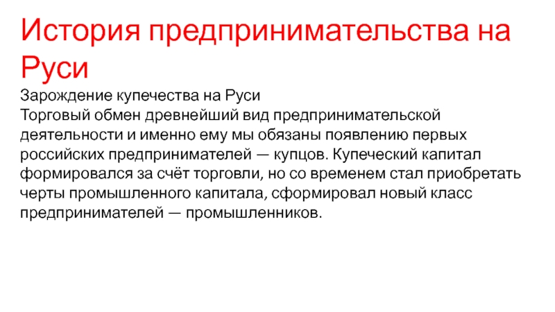 деятельности и именно ему мы обязаны появлению первых российских предпринимателей — купцов. Купеческий капитал формировался за счёт торговли, но со временем стал приобретать черты промышленного капитала, сформировал новый класс предпринимателей — промышленников.