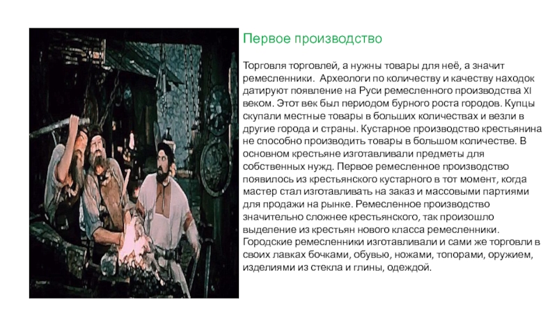 ремесленники. Археологи по количеству и качеству находок датируют появление на Руси ремесленного производства XI веком. Этот век был периодом бурного роста городов. Купцы скупали местные товары в больших количествах и везли в другие города и страны. Кустарное производство крестьянина не способно производить товары в большом количестве. В основном крестьяне изготавливали предметы для собственных нужд. Первое ремесленное производство появилось из крестьянского кустарного в тот момент, когда мастер стал изготавливать на заказ и массовыми партиями для продажи на рынке. Ремесленное производство значительно сложнее крестьянского, так произошло выделение из крестьян нового класса ремесленники. Городские ремесленники изготавливали и сами же торговли в своих лавках бочками, обувью, ножами, топорами, оружием, изделиями из стекла и глины, одеждой.