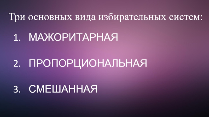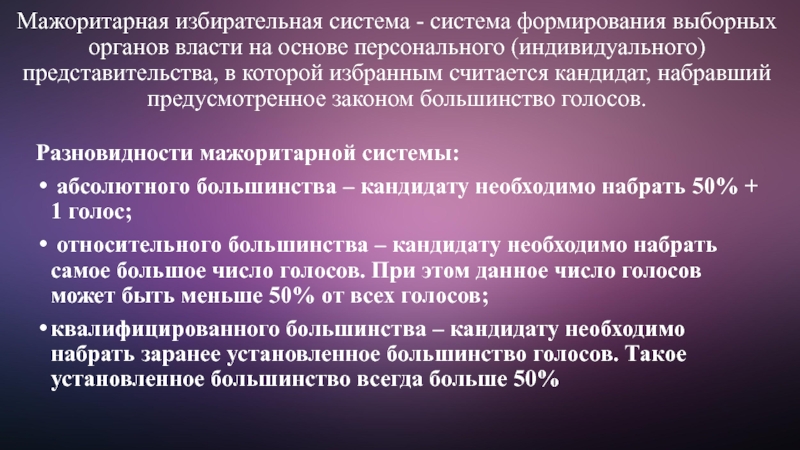 относительного большинства – кандидату необходимо набрать самое большое число голосов. При этом данное число голосов может быть меньше 50% от всех голосов;