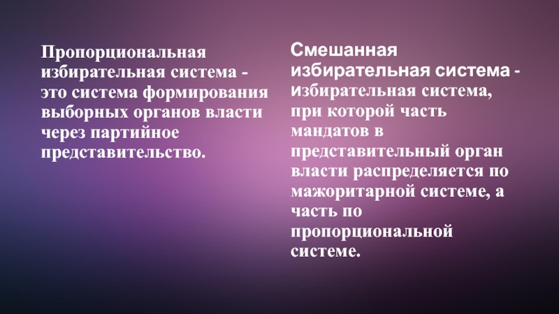 Смешанная избирательная система - избирательная система, при которой часть мандатов в представительный орган власти распределяется по мажоритарной системе, а часть по пропорциональной системе.