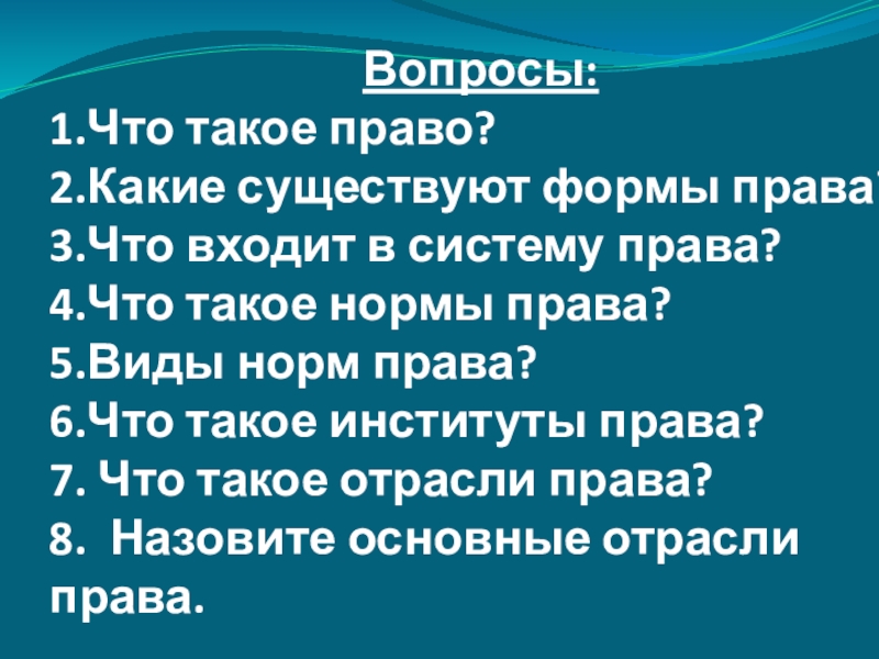 Вопросы:1.Что такое право? 2.Какие существуют формы права? 3.Что входит в систему права? 4.Что такое нормы права? 5.Виды