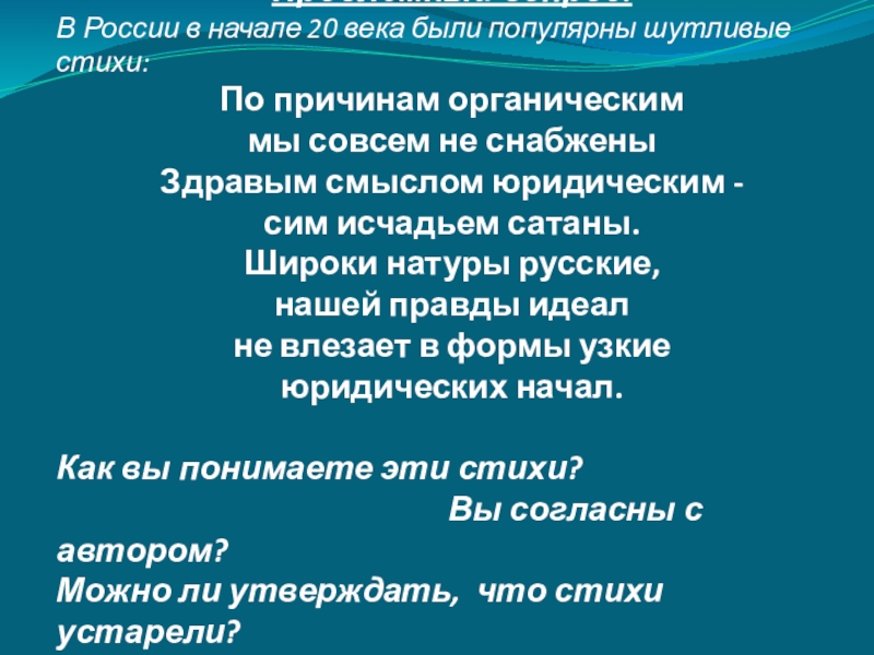 Проблемный вопрос:В России в начале 20 века были популярны шутливые стихи:По причинам органическиммы совсем не снабженыЗдравым смыслом