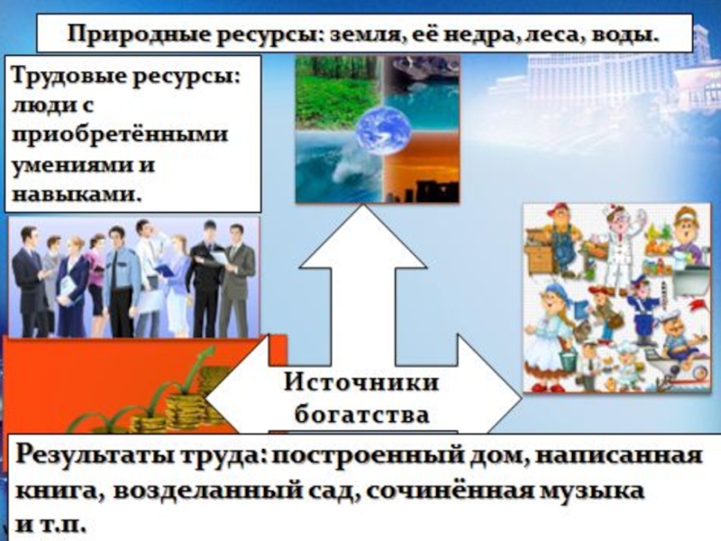 1)природные ресурсы 2)результаты трудовой деятельности 3)знания и умения