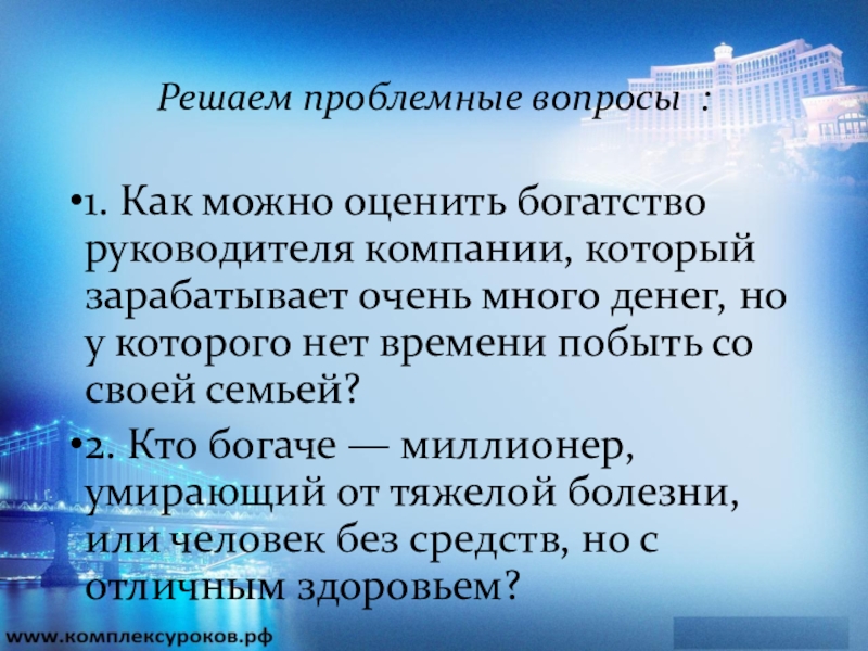 2. Кто богаче — миллионер, умирающий от тяжелой болезни, или человек без средств, но с отличным здоровьем?