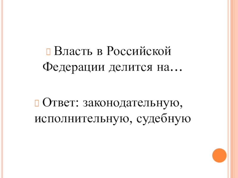 Власть в Российской Федерации делится на… Ответ: законодательную, исполнительную, судебную