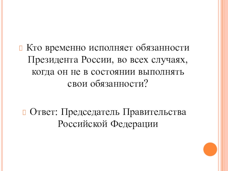 Слайд 10Кто временно исполняет обязанности Президента России, во всех случаях, когда он