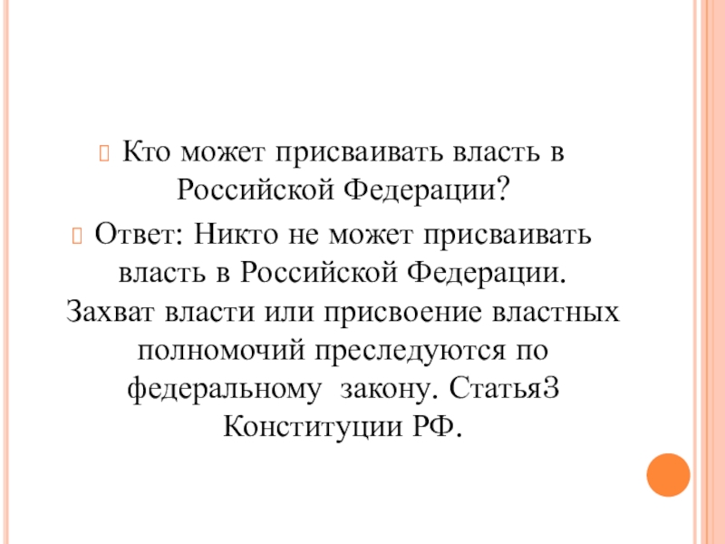 присваивать власть в Российской Федерации. Захват власти или присвоение властных полномочий преследуются по федеральному закону. Статья3 Конституции РФ.