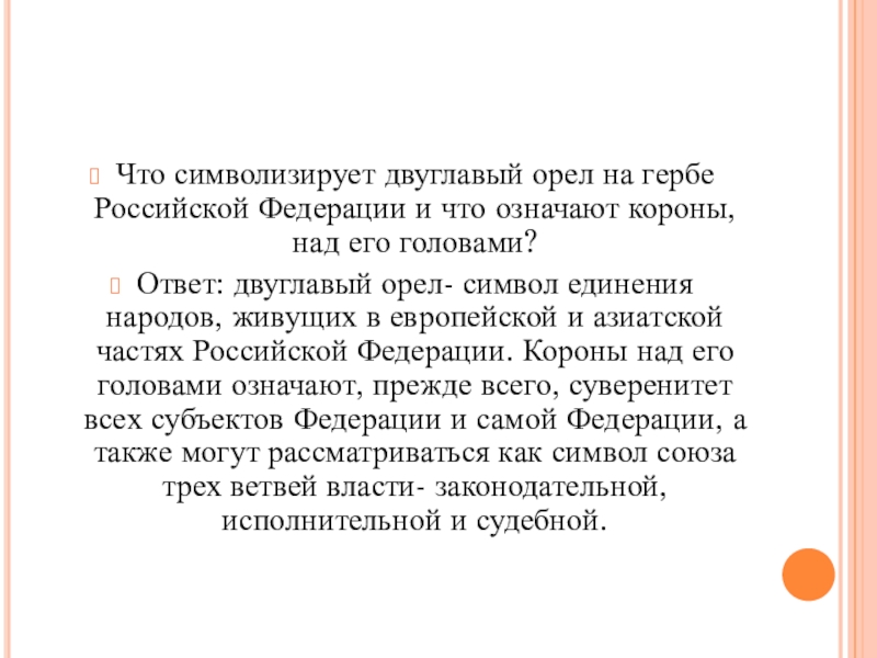 Ответ: двуглавый орел- символ единения народов, живущих в европейской и азиатской частях Российской Федерации. Короны над его головами означают, прежде всего, суверенитет всех субъектов Федерации и самой Федерации, а также могут рассматриваться как символ союза трех ветвей власти- законодательной, исполнительной и судебной.