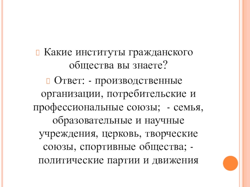 Какие институты гражданского общества вы знаете? Ответ: - производственные организации, потребительские и профессиональные союзы; - семья, образовательные