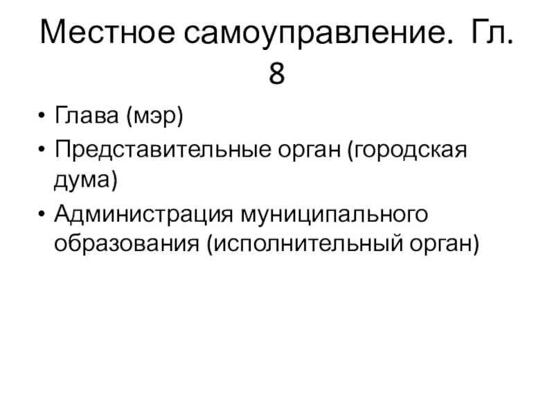 Государственную власть осуществляет президент РФ на 6 лет(К гл4), Федеральное собрание - К. гл5(Совет Федерации (входят по два представителя от субъекта федерации - представительного и исполнительного органа власти) и Государственная Дума на 5 лет – 450 депутатов), Правительство РФ, - исполнительная власть (К гл6) суды РФ,