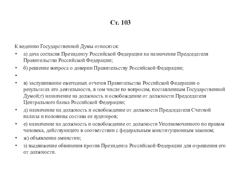 в) заслушивание ежегодных отчетов Правительства Российской Федерации о результатах его деятельности, в том числе по вопросам, поставленным Государственной Думой;г) назначение на должность и освобождение от должности Председателя Центрального банка Российской Федерации;