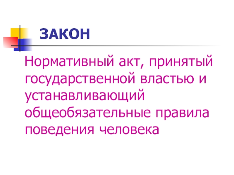 ЗАКОН  Нормативный акт, принятый государственной властью и устанавливающий общеобязательные правила поведения человека